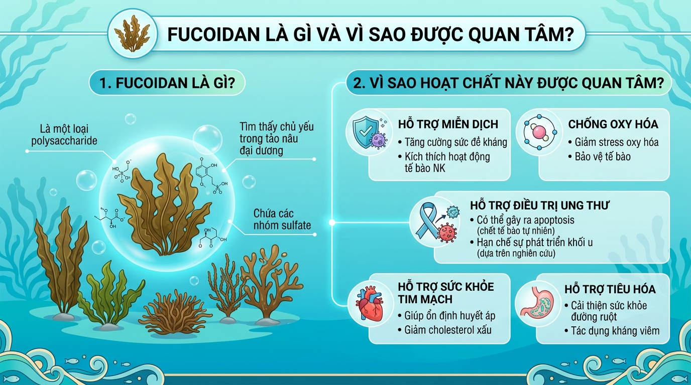 Fucoidan là một hợp chất tự nhiên thuộc nhóm polysaccharide có trong các loại rong biển nâu. Hoạt chất này được phát hiện từ đầu thế kỷ 20 và hiện nay đã trở thành chủ đề của nhiều nghiên cứu liên quan đến miễn dịch, chống oxy hóa và hỗ trợ sức khỏe tổng thể.