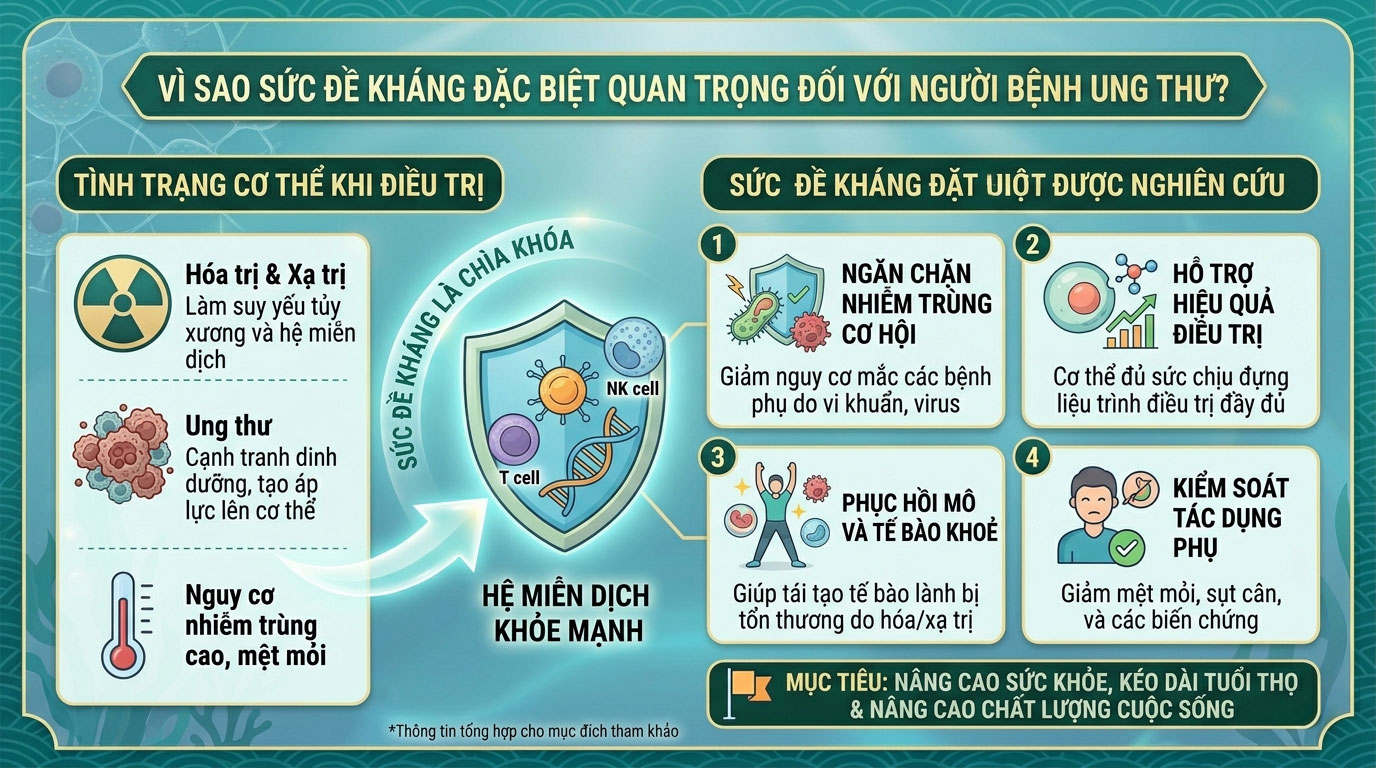 Sức đề kháng đóng vai trò rất quan trọng đối với người bệnh ung thư, đặc biệt trong giai đoạn cơ thể phải đối mặt với nhiều áp lực từ bệnh lý và các phương pháp điều trị. Việc duy trì chế độ dinh dưỡng hợp lý, nghỉ ngơi đầy đủ và bổ sung các dưỡng chất hỗ trợ có thể giúp cơ thể giữ được trạng thái ổn định hơn.